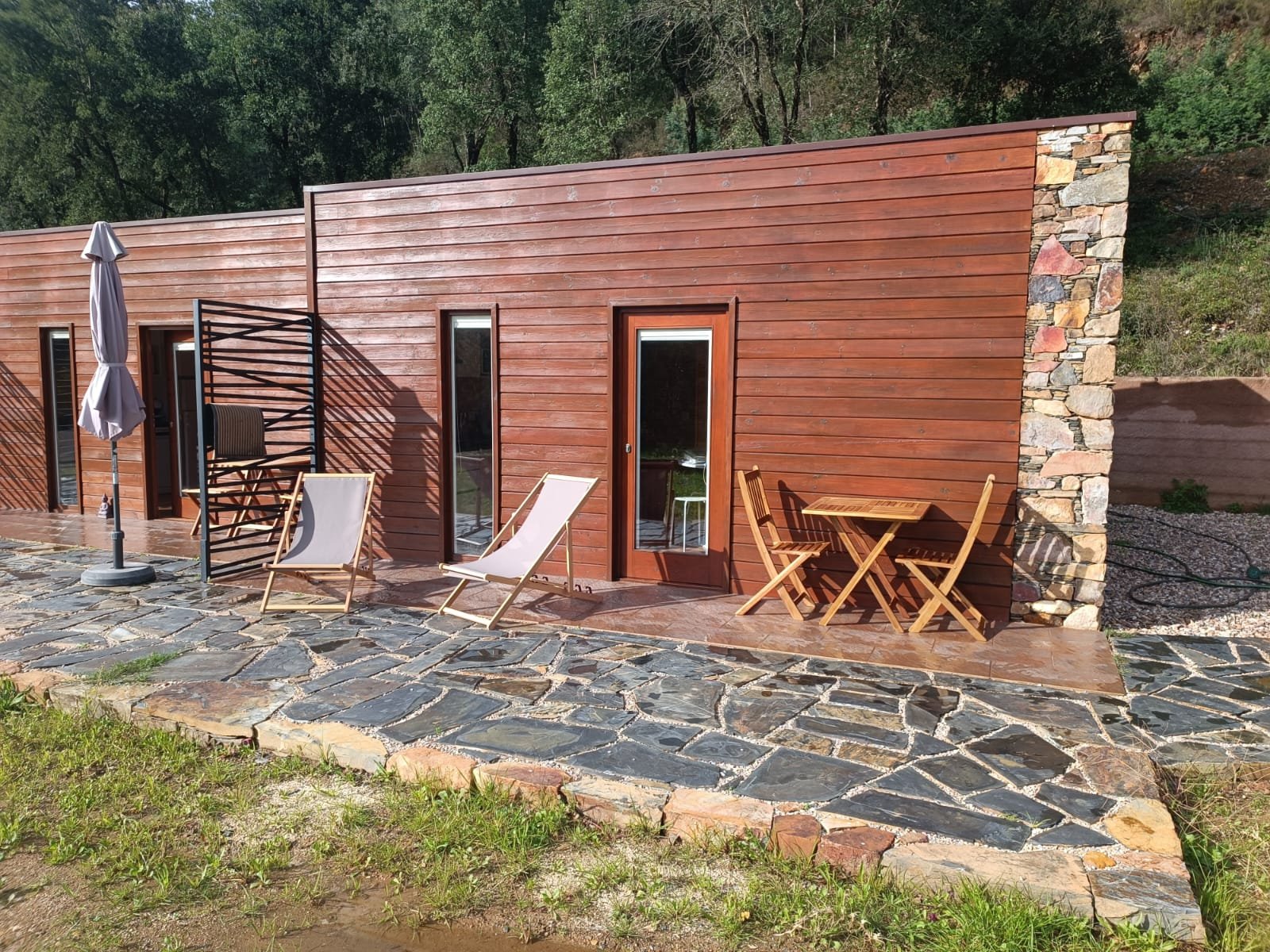 Cada unidade dispõe de quarto duplo com cama de casal, WC, sala de estar com kitchenette equipada e sofá cama e um terraço privativo com vista panorâmica, ideal para momentos de relaxamento ao ar livre. O acesso ao SPA e à piscina completam a experiência, proporcionando bem-estar em plena harmonia com a paisagem natural envolvente.