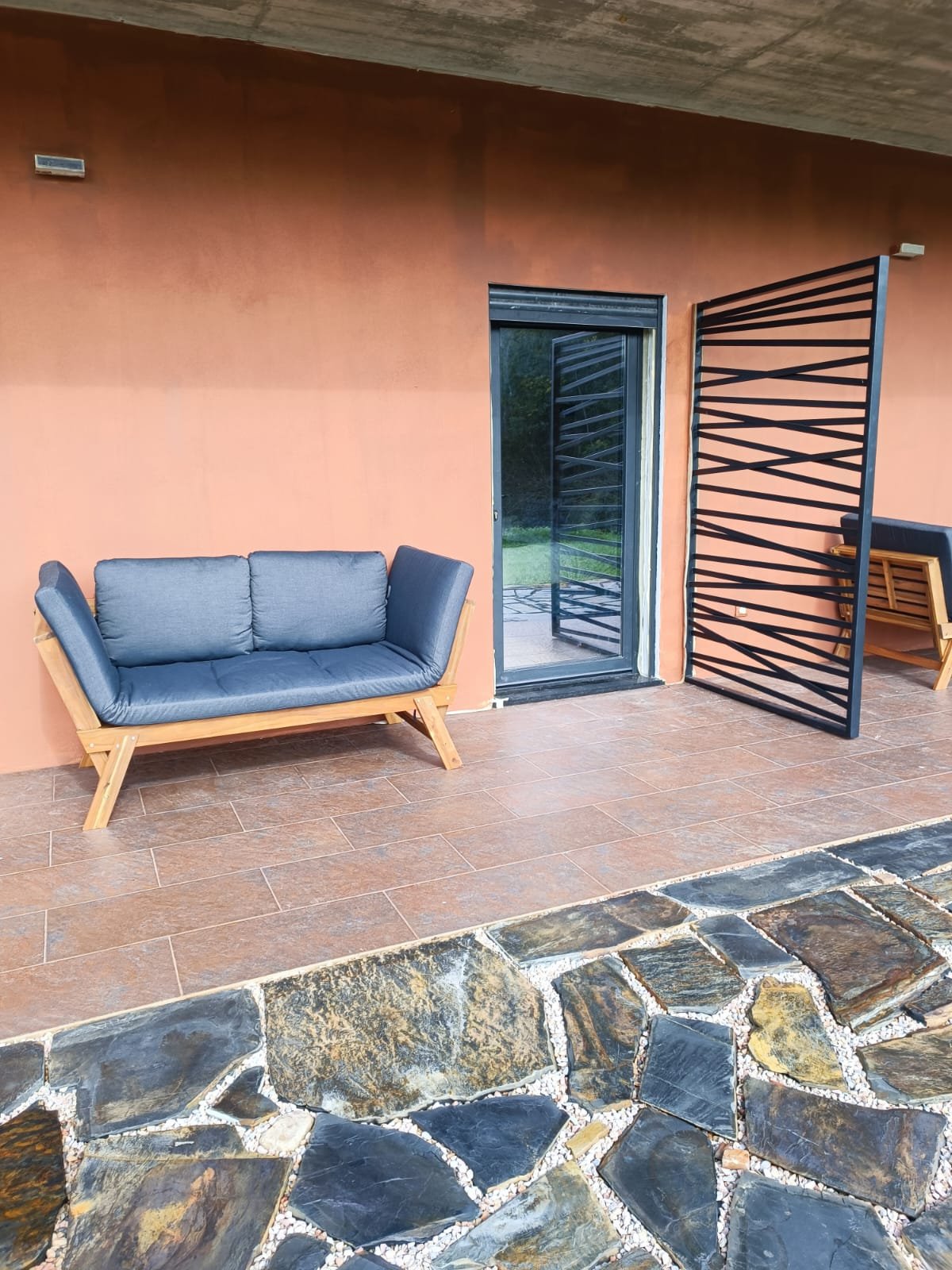 Terraço exterior com sofá e mesa